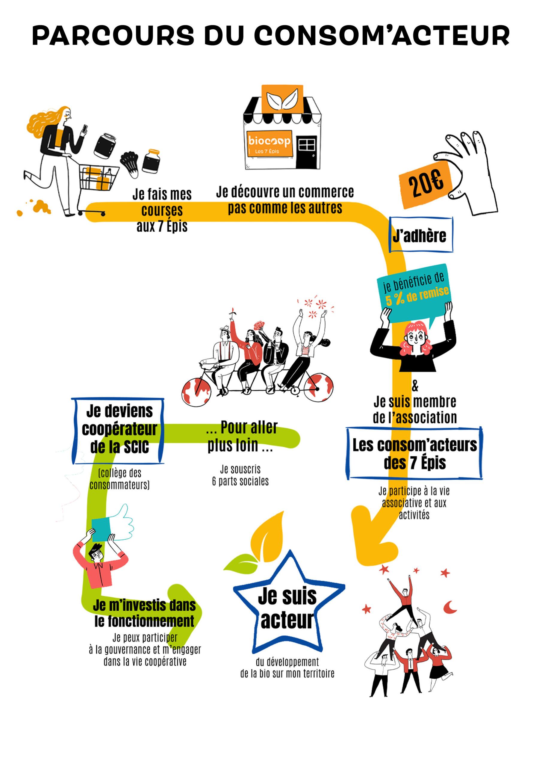 Pour comprendre comment adhérer à la Scic et/ou à l’association des Consom’acteurs des 7 Épis, c’est par ici