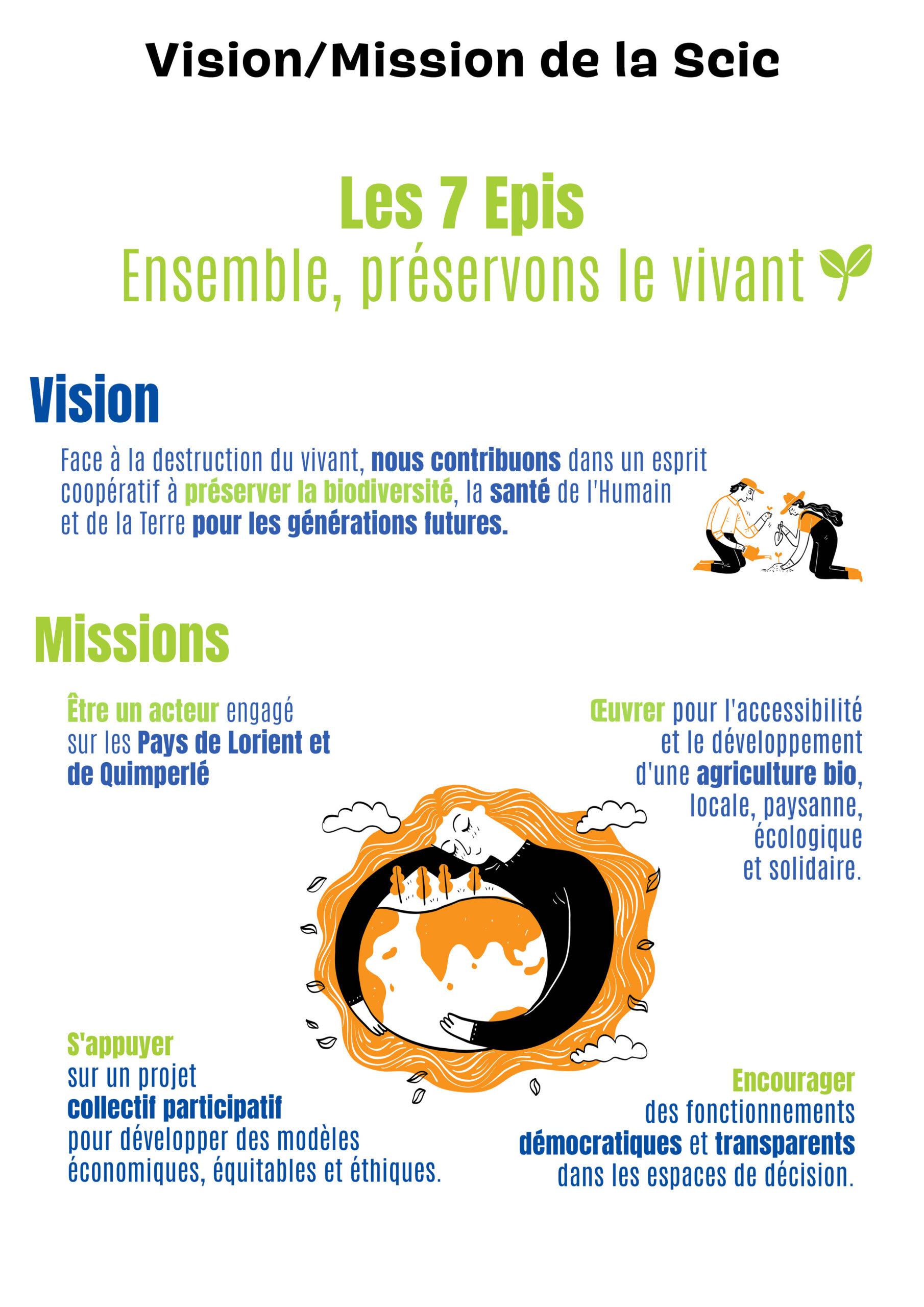 Les 7 Épis, c’est une coopérative d’intérêt collectif, une « Scic ». Elle s’inscrit dans les principes de l’économie sociale et solidaire (ESS). Clients, salariés, producteurs, fournisseurs et partenaires peuvent choisir d’en devenir sociétaires en achetant des parts sociales de l’entreprise.